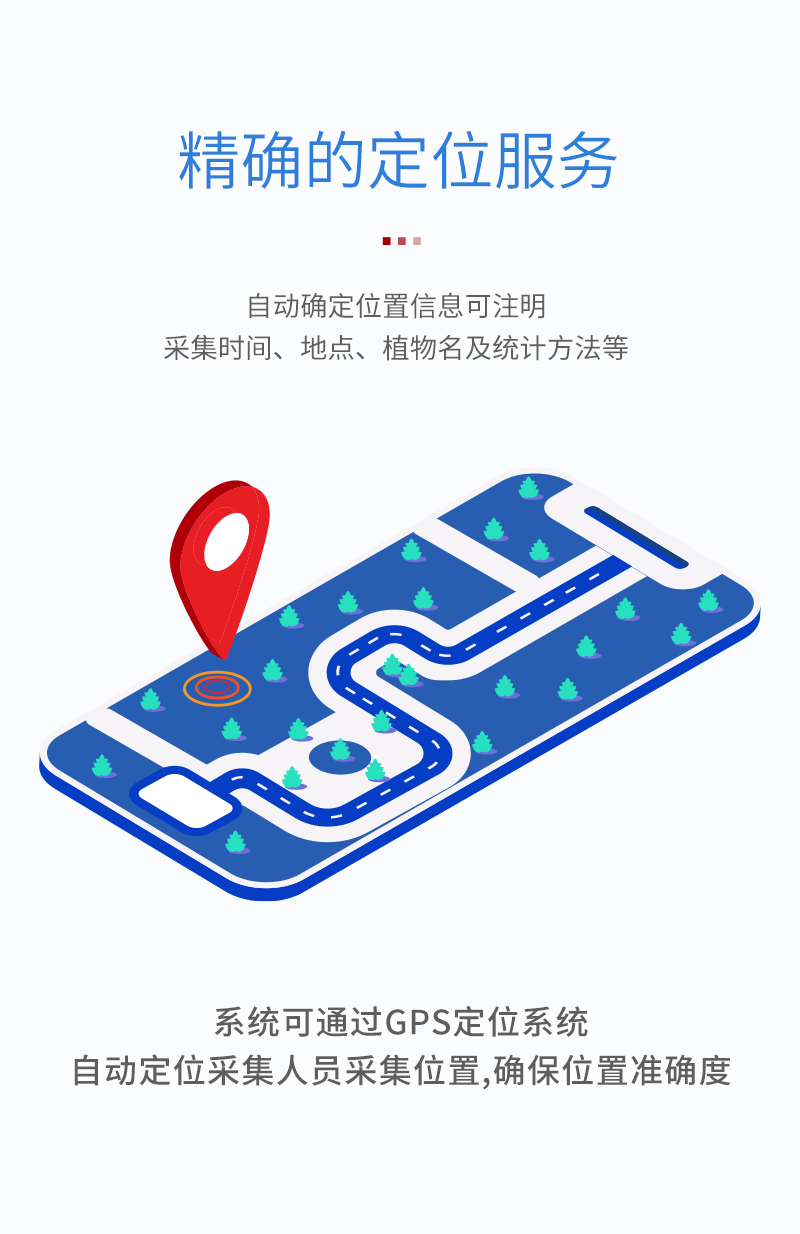 7、精确的定位服务,自动确定位置信息可注明采集时间、地点(含精确经纬度信息)、植物名及统计方法等。