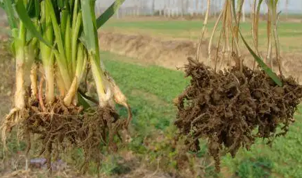 小麦孢囊线虫病是由燕麦孢囊线虫侵染引起。燕麦孢囊线虫侵染为害小麦根部,典型症状足根尖生长受抑,从而造成多重分根和肿胀,次生根增多,根系纠结成团,生长浅薄。受害根部可见附着柠檬形孢囊,开始灰白,后变为褐色。地上部因根系受害而表现分孽减少,矮化,萎蔦,发黄等营养不良症状。小麦孢囊线虫引起病害的程度与土壤中线虫群体密度、寄主的感病性、土壤类型和气候条件等密切相关。病害一般发生在轻砂质土壤,生长季节有适当降雨的年份。另外,线虫幼虫的孵化期与小麦播期相吻合,造成的为害就重。孢囊线虫还常常和土壤中一些其他病原物的侵染为害密切相关,线虫首先侵入小麦根内,其侵染造成的伤口往往成为小麦全蚀病菌和小麦丝核菌等病原真菌侵入的通道。病原物之间的相互促进作用往往造成复合病害,加重了对小麦为害。线虫孢囊可以在土壤中存活一年以上。在适宜的条件下,二龄幼虫借助口针突破卵壳,从孢囊内孵出至土壤中,于土壤孔隙间借助水膜运动,当接近植物根时,会迅速通过口针的机械穿刺作用从根冠侵入,最后将头部定居在中柱鞘、内皮层或与之相毗连的皮层细胞处。在口针穿刺的过程中线虫将食道腺的分泌物注入发育中的维管束细胞,诱导形成一合胞体,供给线虫生长发育所必需的有机营养物质。燕麦孢囊线虫一年发生一代,在整个生活史中,孢囊内幼虫的孵化是一重要环节。温度5〜20℃均可孵化,10〜20℃孵化率最高,超过20℃停止孵化,进入休眠状态。孵化需要高湿度,降雨量直接影响土壤中幼虫的孵化量,在小麦发芽出苗期,降雨多,幼虫量大,小麦受害严重。