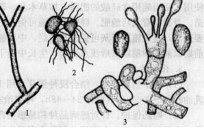 菌丝初为无色,老熟时浅褐色,较粗,有分枝,分枝处缢缩,距分枝不远处有分隔,每细胞有细胞核3〜23个,平均4〜8个。菌核由菌丝体交织纠结而成,初为白色,后变为暗褐色,扁球形、肾形或不规则形,表面粗糙,有少量菌丝与寄主相连,靠病斑的一侧稍凹陷,成熟后易脱落于土壤中。菌核大小不一,明显分为外层和内层,外层由10〜30层坏死细胞构成,约占菌核半径的1/2左右,除细胞壁外,无细胞质和细胞核;内层为活细胞,具有细胞壁、细胞质、细胞核及丰富的颗粒状内含物;菌核具有圆形小孔洞,即萌发孔,菌核形成过程中通过萌发孔排出分泌物,菌核萌发时菌丝也由此伸出。担子倒卵形或圆筒形,顶生2〜4个小梗,其上各着生1个担孢子;担孢子单胞、无色、卵圆形(如图)。