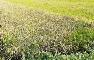 3. 凋萎型国外称克列赛克(Kresek),多在秧田后期至拔节期发生。病株心叶或心叶下1〜2叶先是水渍状、青卷,而后枯萎,随后其他叶片相继青枯。病轻时仅1〜2个分篥青枯死亡,病重时整株整丛枯死。用手挤压病株的茎基部,则可见到大量黄色菌液溢出;在刚刚青枯的心叶上,也常见叶面有珠状黄色菌脓。根据这些特点以及病株基部无虫蛀孔等特征,可与螟虫引起的枯心相区别。