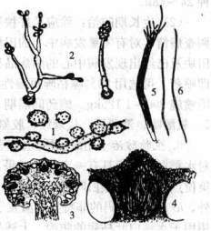 3.子座顶部剖面 4.子囊壳 5.子囊