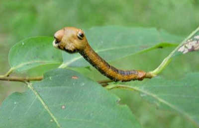 幼虫:一龄幼虫黑色,背线灰白色。末龄幼虫体长为45〜65mm,体色多变,有绿色、灰色、灰黑色等。头部略呈方形,棕褐色,表面散生深褐色瘤状物,头顶中央有1近三角形下陷的褐色斑纹,两侧呈牛角状突出。前胸背面两侧各有角状突起1个,前胸腹面黑色(油桐尺蠖腹面为灰绿色),腹部第八节背面无突起。