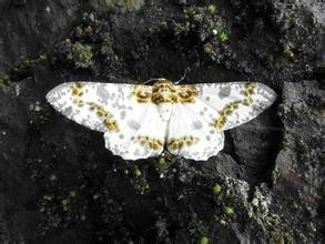 成虫:体长为20〜30mm,翅展为58〜80mm。头金黄,复眼黑色。腹部白色,散生灰、橙色斑,背面杂生棕、白、灰色相间毛簇。翅白色,散布不规则大小灰斑。前翅基部有1较大橙色圆眼斑,前翅中前方及后翅中央各有1灰色圆斑,近外缘各有1串橙、灰斑连成间断的波状带纹。雌蛾触角丝状,体肥大,腹末有棕黄色毛丛。雄蛾触角栉状,体较瘦小,腹末无毛丛。