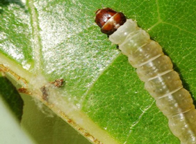 幼虫共6龄。初孵幼虫十分活跃,能迅速爬行或吐丝下垂分散,当遇到嫩芽或未展开的芽叶时,就在叶尖正面吐丝将两侧叶缘向内卷,匿居其中取食上表皮和叶肉,或在芽缝中及两叶自然相叠的嫩叶间取食,留下表皮使被害处呈枯黄色薄膜状。稍成长后向下转移,缀叶为害。随着虫龄增大,食量增加,缀合的叶数也逐渐增多,常4〜5叶至10叶缀结一苞,将苞内叶片食成缺刻或孔洞。幼虫三龄后受惊动时,能迅速后退离苞,吐丝下垂或弹跳逃逸。幼虫老熟后多脱离原来的虫苞,重新吐丝缀结2〜3叶,化蛹于其中。