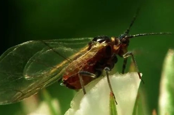 有翅雌若蚜:体长约1.8mm,棕褐色,翅芽乳白色。