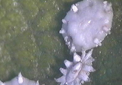 成虫:雌成虫介壳近半球形,蜡质白色硬厚。前期拱现龟纹,中央有1圆突;周缘有8个小圆突,其间夹有洁白蜡点,或被霉污变黑。后期体大拱成半球形,灰白至灰黄色,背面龟甲状凹陷明显。成长介壳长约4.20mm,宽约2.80mm。雌成虫体椭圆,暗紫褐色,长为2.5〜3.3mm;触角6节,第三节最长,为其余5节之和;足3对,较发达。雄成虫体长为1.00〜1.28mm,翅展为1.80〜2.23mm,棕褐色,头、胸背色较深,眼黑色,触角线形。