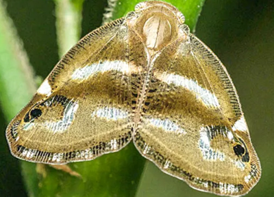 成虫:体长为7〜9mm,翅展为11〜15mm。体褐色至深褐色,以中胸背板色最深,腹面色浅,后翅色淡,前翅油状光泽明显。额具中脊,无侧脊,前胸背板具中脊,两边有刻点;中胸背板具中脊3条,中脊长而直,侧脊从中部向前分叉,二内叉内斜,端部互相靠近,外叉短,基部断开。前翅广阔,外缘和内缘长度相等;前缘的横脉域和外缘整齐排列的端室连成一宽带,并略呈波状;前缘近端部2/5处有一长三角形透明斑,近顶角有一黑褐色隆起眼斑;内横带透明,宽而略呈弧形,前端不到前缘的横脉域;外横带由2条透明的短横带组成,其前带的末端向内伸岀一小叉;内外横带之间近顶角处有一黑褐色隆起的眼斑。后翅翅脉色深,二横带均无色透明,带上的脉纹白色;翅后缘有无色透明纵条。后足胫节外侧具2个大刺和1个极小的刺。