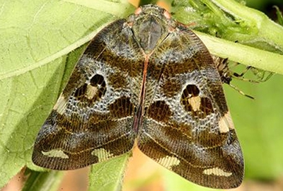 成虫:体长为11〜12mm,翅展为42〜46mm。额唇褐色,前胸背板黑色,额具有中脊和侧脊,中脊较长,侧脊短小。唇中脊不完整,前胸背板较窄,具中脊,中脊两侧有明显的刻点。中胸背板宽大于长,具有三条脊,中脊长而直,侧脊具有分支,侧脊分支长度约为侧脊的1/4。前翅灰黑色大三角形,颜色均匀,前缘端部1/3处有一浅黄褐色几乎不透明的近梯形斑。一半透明斑在外缘臀角近1/3 处,斑上方近顶角处还有一半透明斑;翅面中央有一圆形黑色环带,环内有一圆形半透明斑;翅面上散布有黄、白和褐色的蜡粉,不同颜色的蜡粉在翅面形成隐约可见的两个大圆斑。后翅无斑纹,翅脉黑色。足不透明,黄褐色。胫节末端具有端刺7个,后足胫节具有大侧刺2个,短侧刺1个。第三附节端部具有钩状端刺2个。