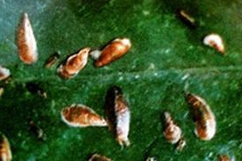 幼、若螨:幼螨初期体裸露,有光泽。若螨黄褐至紫褐色,近菱形,开始被白色蜡絮,后体段环纹不明显,体长为0.05〜0.10mm。
