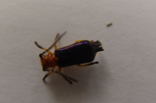 成虫:体长为9〜11mm。头、前胸背板及小盾片绛红色,前胸背板中部有1疣突。触角柄节绛红色,第三、四节基部橙黄色,其余皆为黑色。复眼黑色。鞘翅蓝色带紫色光泽,散生粗刻点。腹面橙黄色。各足跗节及胫节端部1/3〜2/3黑色,其余橙黄色。全体多毛。
