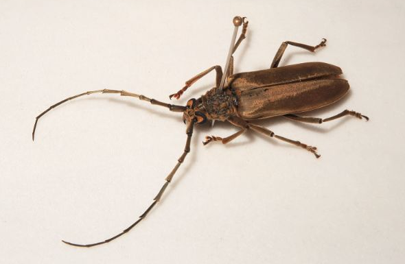 成虫:体长约30mm,暗褐色,有光泽,生有褐色密短毛。头顶中央具1条纵脊。复眼黑色,两复眼在头顶几乎相接。复眼后方具1短且浅的沟。触角中、上部各节端部向外突并生1小刺。雌虫触角与体长近似;雄虫触角为体长近2倍。前胸宽大于长,前端略狭,中部膨大,两侧近弧形,背面具皱,小盾片末端钝圆;鞘翅上具浅褐色密集的绢丝状绒毛,绒毛具光泽,排列成不规则方形,似花纹。