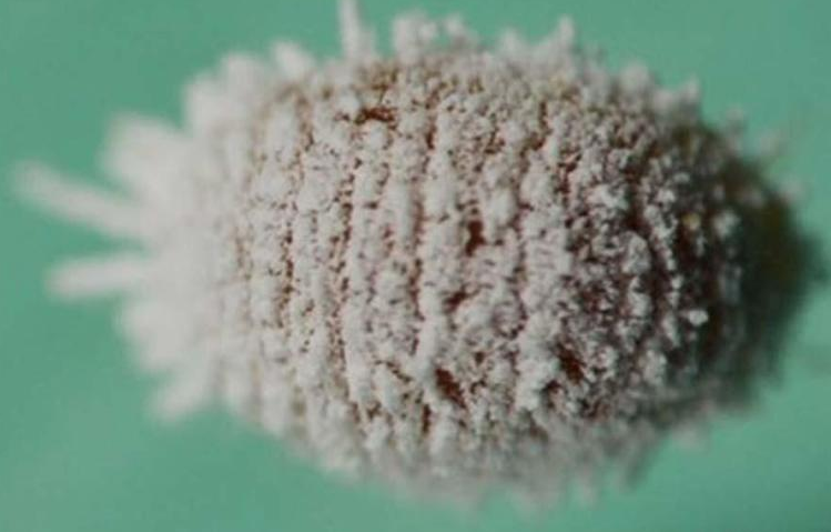 若虫:新菠萝灰粉蚧若虫有3个龄期,初孵化的若虫(一龄若虫)呈长椭圆形,体色为橘黄色,虫体长约0.5mm,分节明显。单眼1对,红色。触角为8节。背部无白色蜡质物,发育至一龄若虫后期,该虫背部有少量均匀的蜡质物分布。二龄若虫黄褐色变淡,灰色加深,随着虫龄增长,体表逐渐被均匀的蜡质物覆盖。在二龄若虫的后期虫体基本呈现灰色。达到三龄若虫时虫体被自身所分泌的蜡质物均匀覆盖。