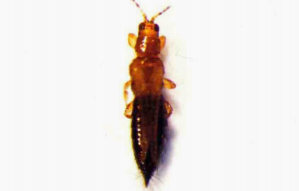 雄成虫:体较雌虫略小,体长0.9〜1.0mm,体黄色,腹部第三至七节腹片有横腺域。