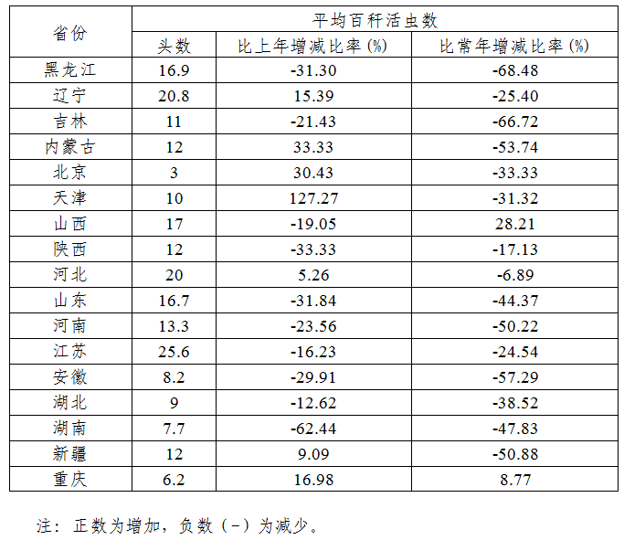 据春季各地剥秆调查,大部地区玉米螟冬后虫源基数比常年和上年偏低,延续了近年来发生基数逐年下降的趋势。平均百杆活虫数,江苏、辽宁、河北分别为25.6头、20.8头、20头,黑龙江、吉林、内蒙古、天津、山西、陕西、山东、河南为10—20头,其他省份10头以下(见表1)。